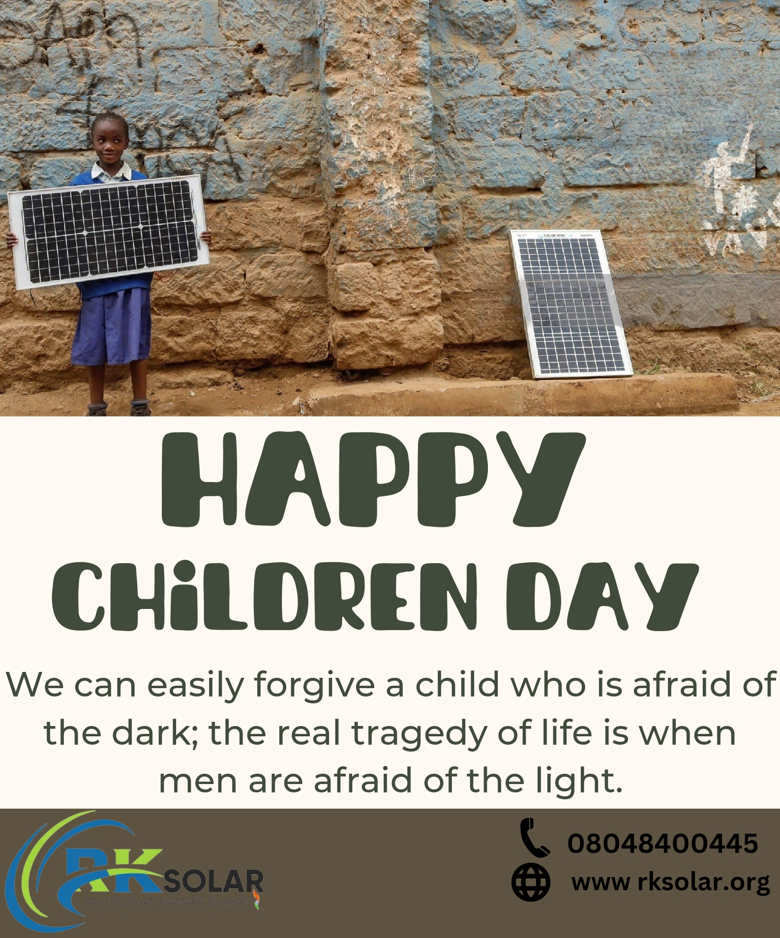 We can easily forgive a child who is afraid of the dark; the real tragedy of life is when men are afraid of the light. HAPPY CHILDREN DAY. -RK Solar Ph-08048400445 Web- www.rksolar.org
